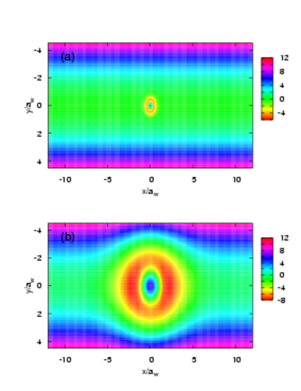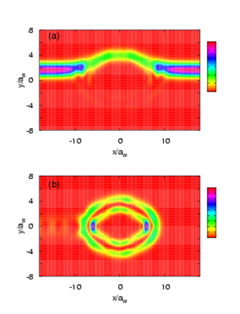 Við athugum niðurstöður fyrir tvenns konar hringi í vírnum, annan lítinn en hinn stóran. Vírinn sjálfur er frekar breiður, skölunarstikinn fyrir lengd aw=33 nm hér
