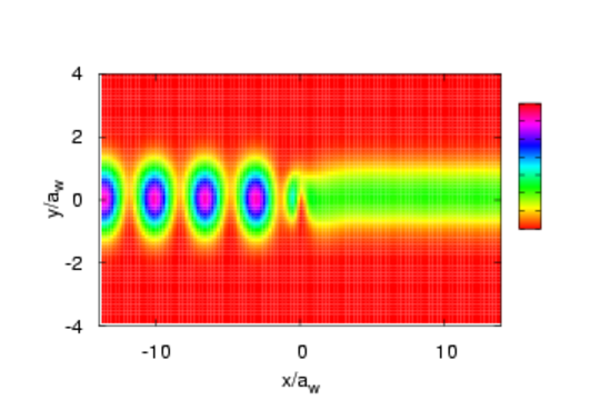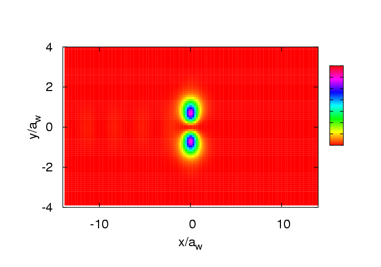 Leiðni vírsins með smáa hringnum er ekki þrepafall svo ljóst er að hringurinn hefur mikil áhrif þó hann sé smár. Lítum á líkindadreifingu rafeindanna fyrir gildi á X rétt fyrir neðan X=1.5 áður en vírinn lokast. aw=33 nm og B=0.1 T hér