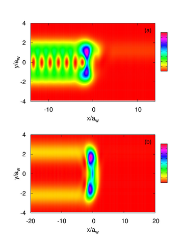 Litli hringurinn er staðsettur í miðjunni nærri x=0. Innbylgjan víxlast við spegluðu bylgjuna sem endurvarpast út til vinstri frá hringnum og myndar þannig víxlmynstrið til vinstri á myndinni. Aðeins einn þversveifluháttur heldur áfram til hægri og því sést ekkert víxlmynstur þar. Hið veika segulsvið B=0.1 T nægir til þess að rjúfa samhverfuna um langás vírsins. Við X=1.5 lokast vírinn og fyrir aðeins hærra X leiðir hann algerlega, G(E)/G0=1. Þetta er svo kölluð Fano-herma, sem verður þegar eitt af eiginástöndum hringsins lendir inn í samfellda orkurófi ástanda vírsins. Innbylgjan lendir í hermu við þessa orku og endurkastast algerlega fyrir eitt gildi X og sleppur óbreytt í gegn fyrir aðeins hærra gildi. Þetta sést best á líkindadreifingunni