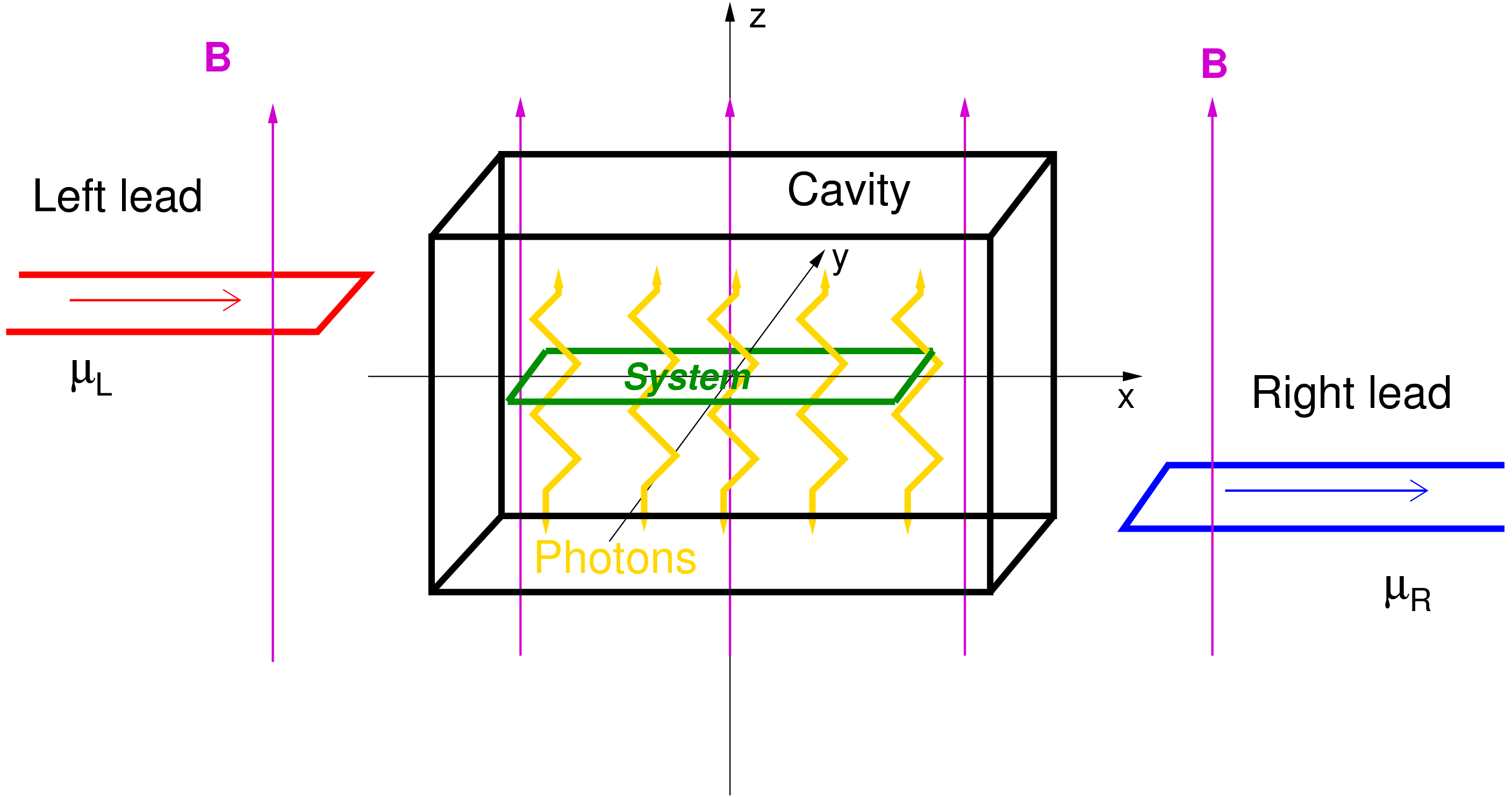 Hugsum okkur tvær ytri leiðslur með mikinn rafeindaþéttleika. Hvor um sig er í jafnvægi við fasta spennu. Við veljum þá til vinstri til þess að vera við hærri spennu en þá til hægri. Fyrir klukkan t=0 er heildarkerfið í þremur ótengdum hlutum. Miðlægt er tvívítt rafeindakerfi sem getur innihaldið nokkrar rafeindir. Þetta kerfi er á nanóskala og rafeindunum er haldið í innilokunarmætti sem er með harða veggi í x-stefnu, en mjúka fleygbogainnilokun í y-stefnu. Rafeindirnar í miðlæga kerfinu víxlverka með krafti Coulombs, sem er fráhrindandi fyrir eindir með samskonar hleðslu. Kerfið er endanlegt að stærð og orkuástönd kerfisins í jafnvægi eru því strjál. Leiðslurnar eru hálfóendanleg tvívíð rafeindakerfi með verulegan rafeindaþéttleika og samfelld orkuróf. Vegna hás þéttleika rafeindanna og einsetulögmáls Paulis leyfum við okkur að horfa fram hjá Coulomb-víxlverkun rafeindanna í leiðslunum. Þvert á þessi 3 tvívíðu rafeindakerfi hugsum við okkur einsleitt fast segulsvið (í z-stefnu). Hátt segulsvið getur leitt til verulegra hleðslustrauma á jöðrum kerfanna, jaðarstrauma, en við munum aðeins athuga lágt segulsvið hér, B=0.1 T.