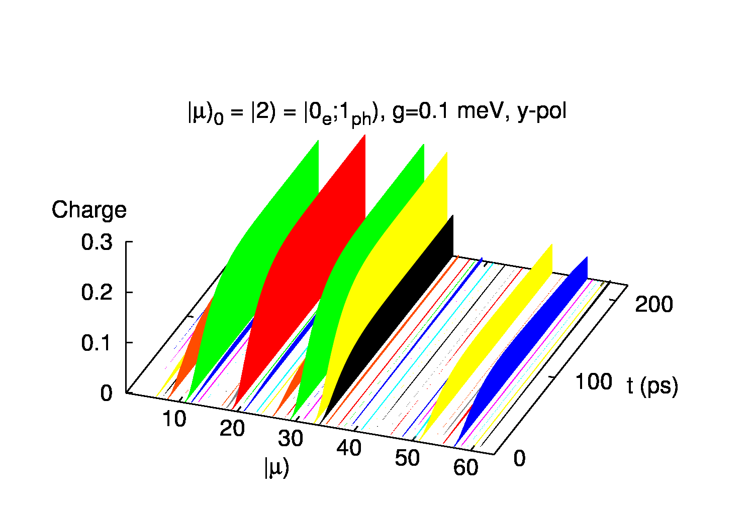Hér að neðan eru myndir sem sýna líkindi þess að hleðsla (rafeind) sem kemur inn í kerfið setjist í fjöleindaástand 〡μ〉. Kerfið er í upphafi án rafeinda en með eina ljóseind, þ.e. að ástand 〡2〉er setið í upphafi. Myndirnar eru fyrir mismunandi skautunarstefnu ljóseindarinnar. Dreifing líkindanna í ástöndin sýna vel að kerfið er ekki í jafnvægi.