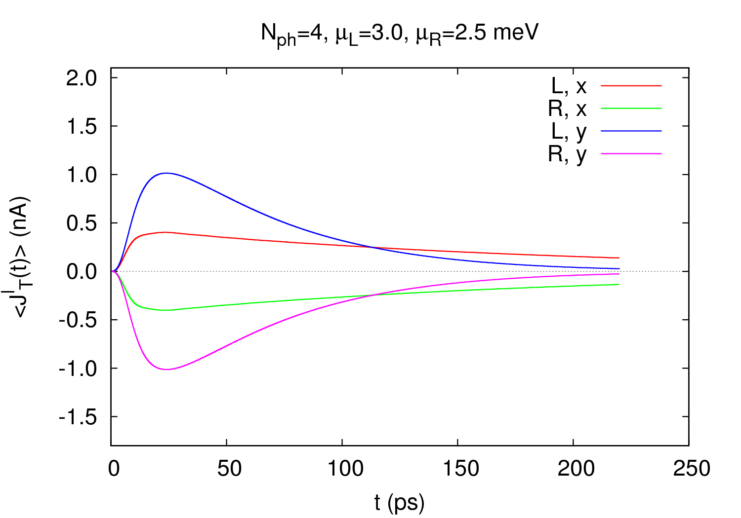 Á næstu tveimur myndum eru heildarstraumarnir inn í kerfið vinstra megin og út úr kerfinu hægra megin sýndir sem fall af tíma fyrir mismunandi upphaflegan ljóseindafjölda í því. Í upphafi eru engar rafeindir inni í kerfinu. Þess vegna flæða rafeindir inn í það frá báðum áttum og hægri straumurinn JR er neikvæður í upphafi. Hér virðast straumarnir stefna á gildi sem gefa til kynna engan heildarstraum í gegnum kerfið þegar kerfið er komið í stöðugt ástand. Þetta er vegna þess að kerfið er lítið og rafeindin í kerfinu kemur í veg fyrir að sú næsta komi inn í það. Fyrirbærið kallast Coulomb-lokun. Hægt er að yfirvinna hana með hærri forspennu á kerfið.