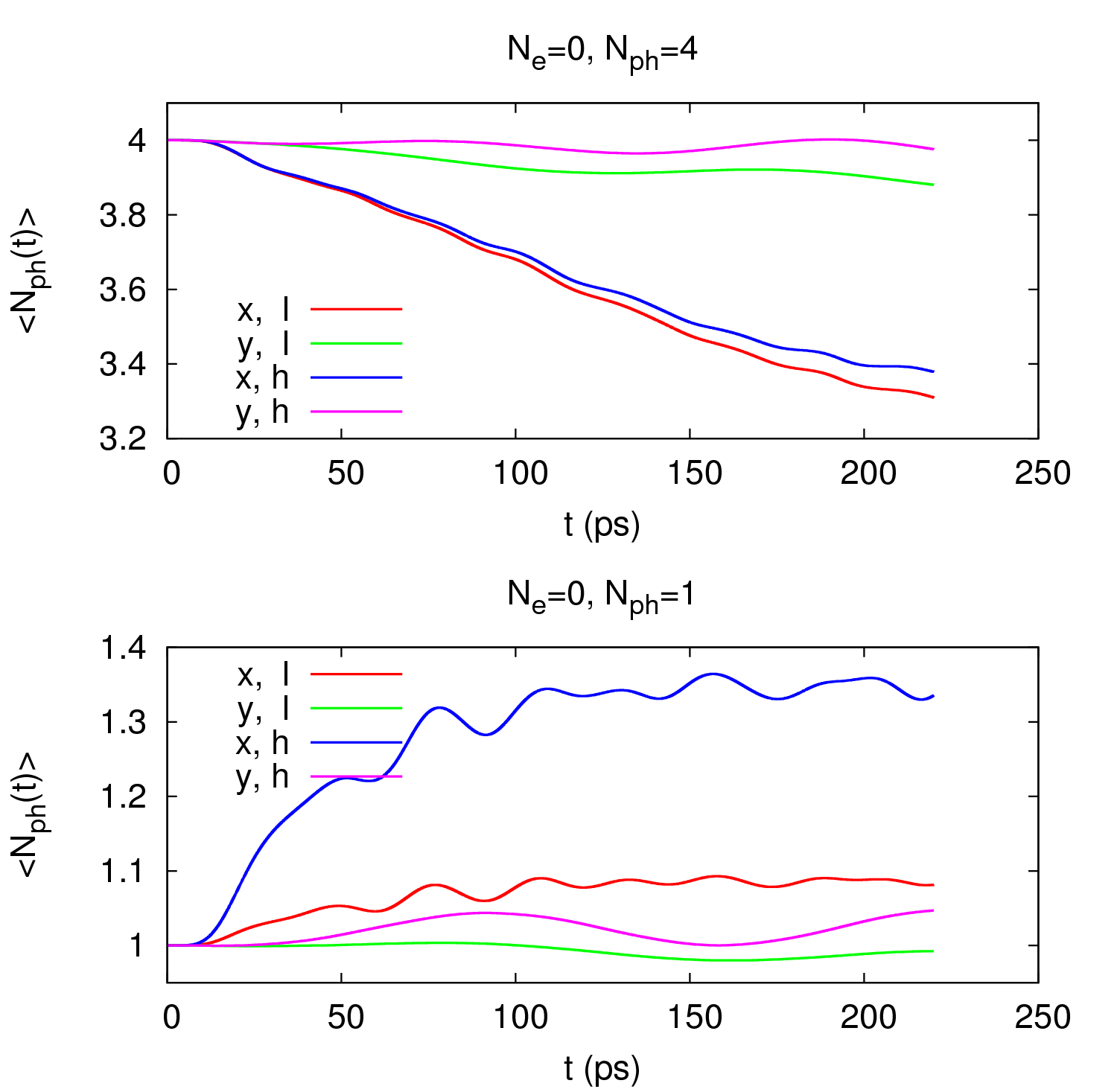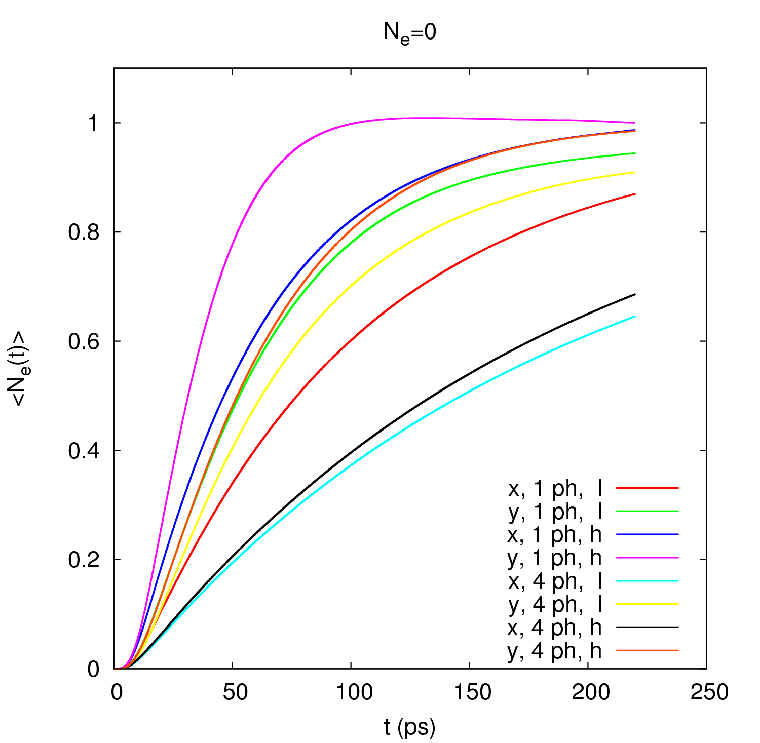 Nú veljum við forspennu milli vinstri og hægri leiðslu og reiknum tímaþróun kerfisins þegar í því klukkan t=0 er engin rafeinda en engin eða nokkrar ljóseindir. Nákvæmari lýsing á upphafstikum, kerfinu og líkaninu má finna í [3]. Næsta mynd hér að neðan til vinstri sýnir líkindi meðalfjölda rafeinda í kerfinu (S) sem falli af tíma t fyrir mismunandi ljóseindafjölda í upphafi og mismunandi skautun ljóseindanna langs eftir kerfinu í flutnings átt (x-skautun) eða þvert þar á (y-skautun). Aukinn ljóseindafjöldi virðist tefja hleðslu kerfisins. Ljóseindirnar dreifa rafeindunum út úr forspennuglugganum milli víranna, en það eru einmitt ástöndin innan hans sem leiða best í kerfinu. Myndirnar hægra megin sýna heildar meðalljóseindafjöldann sem fall af tíma, efri myndin fyrir upphaflega 4 fjóseindir í kerfinu og sú lægri fyrir eina ljóseind upphaflega í kerfinu. Í kerfinu með 4 ljóseindir virðist sem þeim fækki með tíma. Þær örva rafeindir í hærri orkustig. Það öfuga gerist fyrir kerfið með eina ljóseind upphaflega. Þar fjölgar ljóseindunum við að rafeindir fara á lægri orkustig. Mikill munur er á skautunarstefnum ljóseindanna. Það er vegna þess að orka ljóseindanna er nærri orkumun á rafeindastigum sem lýsa hreyfingu rafeinda eftir kerfinu í x-átt.
