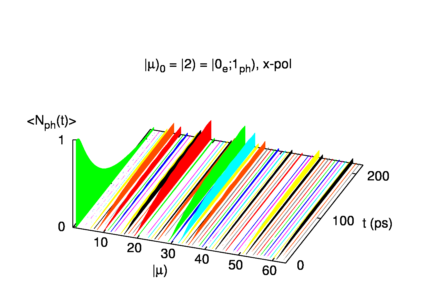 Að lokum er sýnd dreifing ljóseindanna í fjöleindaástöndin 〡μ〉. Upphaflega er ein ljóseind í kerfinu og aðeins ástand 〡2〉setið sem lýsir einmitt því. Í upphafi þegar rafeindastraumurinn er hár inn í kerfið víxlverka ljóseindirnar og rafeindirnar hratt og setja mörg mismunandi ástönd sem flest standa fyrir sýndareindir samsettar úr ljós- og rafeindum.