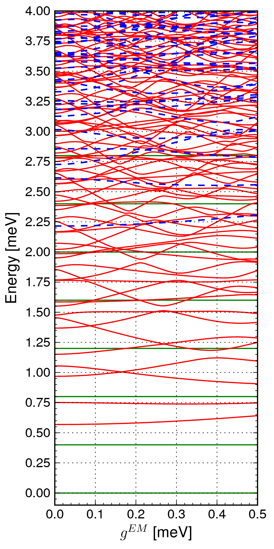 Til þess að ráða við verkefnið að finna orkuróf og ástönd lokaða kerfisins (án HT) verðum við að ráðast á það í nokkrum skrefum. Fyrst útsetjum við H0+HCoul í óvíxlverkandi Fockgrunninum og finnum orkuróf og ástönd þessa virkja, Coulombvíxlverkandi rafeinda í lokuðu kerfi. Síðan notum við einoka ummyndun til þess að umskrifa afganginn af H í þessu nýja ástandarúmi. Næst er bætt við ljóseindunum og víxlverkuninni við þær, HEM+He-EM, og nýtt ástandarúm og orkuróf fundið. Myndirnar hér að ofan, í miðið og til hægri, sýna fjöleindaorkuróf þessa lokaða kerfis sem fall af víxlverkunarstyrk gEM rafeindanna og ljóseindanna. Grænu láréttu línurnar sýna orku ástanda sem einungis innihalda ljóseindir og engar rafeindir. Þess vegna breytist orka þeirra ekki með gEM. Lægsta græna línan er grunnástand kerfisins, það er tóma ástandið með engar rafeindir, og meðalfjöldi ljóseinda er 0, en núllpunktshreyfingar skammtaða rafsegulsviðsins leiða til ljóseindaflökkts sem hefur áhrif á kerfið. Rauðu ferlarnir sýna orku ástanda sem innihalda eina rafeind og einhvern fjölda ljóseinda. Bláu ferlarnir sýna orku ástanda sem innihalda tvær rafeindir og einhvern breytilegan fjölda ljóseinda. Rafeindafjöldinn er alltaf fastur því kerfið er lokað, en ljóseindafjöldinn er breytilegur vegna þess að rafeindir geta hoppað milli ástanda með því að gleypa eða senda frá sér ljóseind. Ef við settum rafeind eða rafeindir inn í kerfið (S) verður víxlverkunin milli ljóseindanna og rafeindanna til þess að nýjar sýndareindir myndast. Þær eru samsettar úr vissum fjölda rafeinda og breytilegu hlutfalli af skömmtuðu rafsegulsviði, þ.e. ljóseindum.